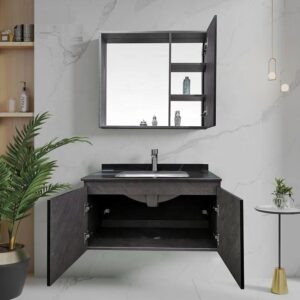 dark grey washbasin with cabinet mirror